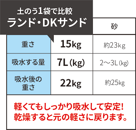 『ランド・DKサンド』は、従来の砂よりも約65%軽く、たくさんの土のう詰めも楽々!
